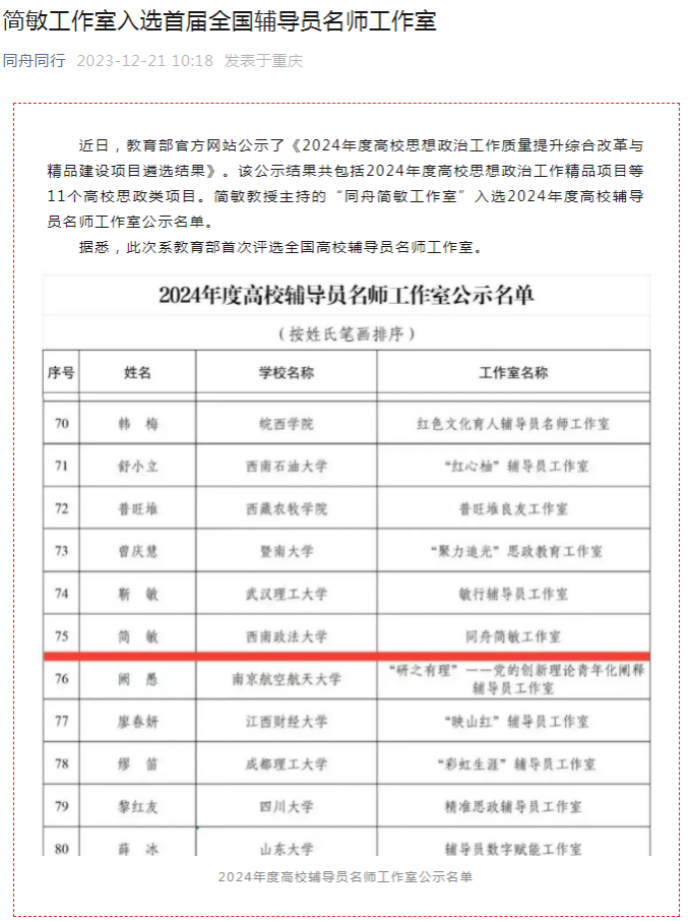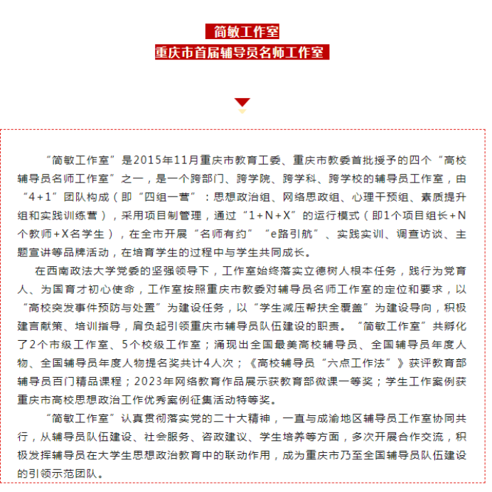太阳成集团tyc234cc89届员工简敏,现为西南政法大学辅导员,全国辅导员年度人物,是重庆市唯一的教授型一线专职辅导员。近日,简敏工作室入选首届全国辅导员名师工作室。